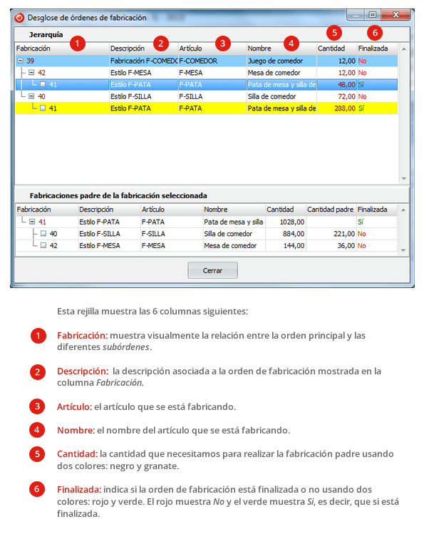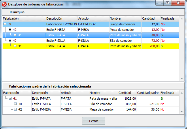 Como podemos ver en la imagen la última fila de la rejilla está resaltada en amarillo. Este resaltado nos sirve para localizar fácilmente las subórdenes que aparecen más de una vez en la jerarquía. En la misma imagen vemos que está seleccionada la primera orden de fabricación que tiene código 41 y que, al mismo tiempo, esta resaltada en amarillo la última fila que tiene el mismo número de orden de fabricación. Si en el ejemplo que estamos utilizando la fila seleccionada fuera la última, la fila que aparecería resaltada en amarillo sería la primera.