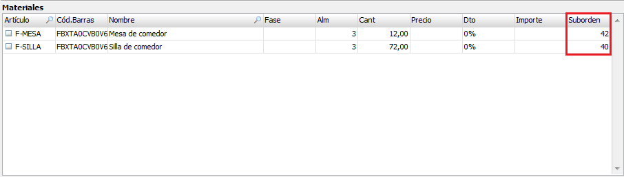 Si en vez de indicarnos que el origen es un documento de venta se nos informa de que el origen es otra orden de fabricación, lo que estaremos viento en pantalla será una suborden de fabricación.