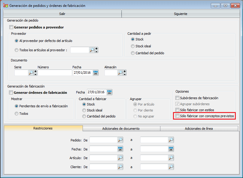 Utilización de conceptos previos desde la pantala de Generación de pedidos y órdenes de fabricación