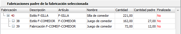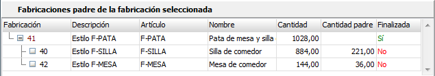 - Rejillas de fabricaciones padre de la fabricación seleccionada