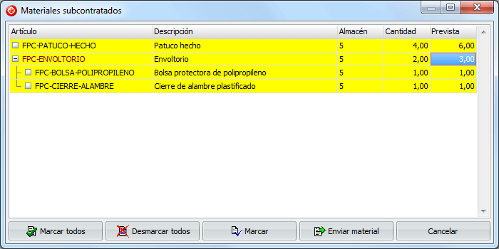 Enviar: desde aquí enviamos el material previsto al almacén de la subcontrata.