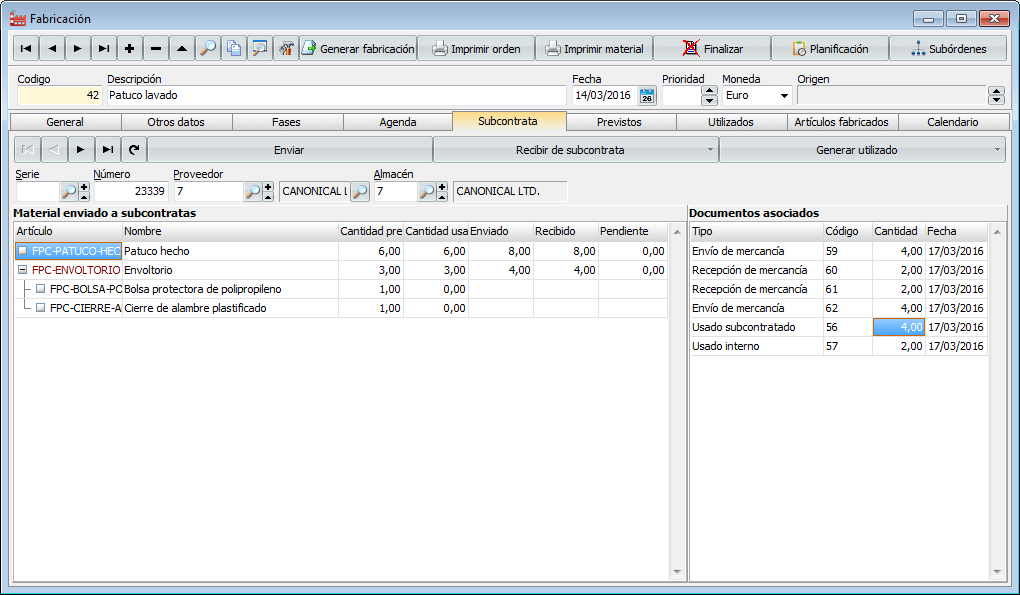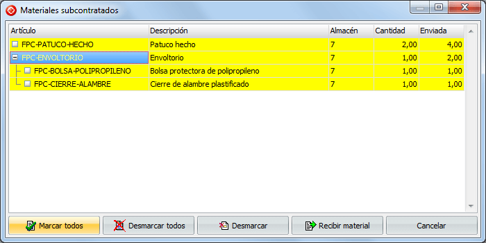 Recibir de subcontrata: desde aquí recibimos material del almacén de la subcontrata. Este botón nos permite tanto recibir toda la mercancía enviada como recibir únicamente la mercancía actualmente seleccionada.