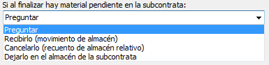 Si al finalizar hay material pendiente en la subcontrata nos permite controlar el comportamiento de la aplicación cuando finalicemos la orden de fabricación seleccionada. Las opciones disponibles son las siguientes: