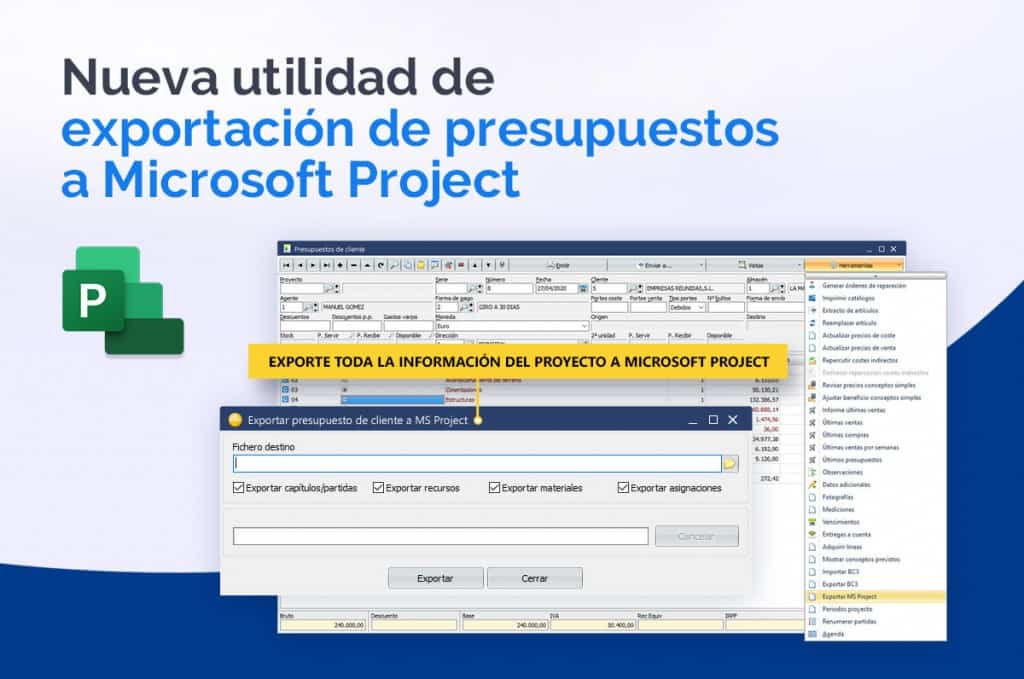 En nuestra constante por mejorar, hemos avanzando en las opciones e integraciones con SQL Obras, por lo que ya está disponible en su última versión, una exportación a Microsoft Project, la utilidad incluida de serie en el programa genera un XML con una estructura que Project reconoce.