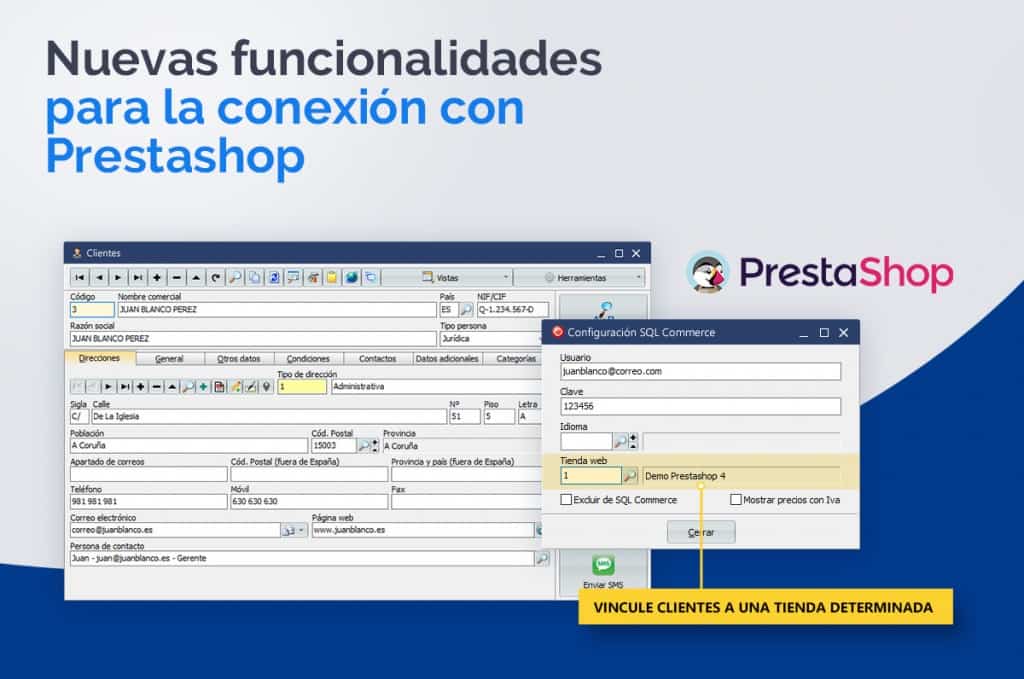 El módulo de comunicación con Prestashop permite entre otras cosas enviar nuevos clientes creados desde la aplicación a la tienda online, y recibir los que en ella se den de alta. En caso de trabajar con una instalación de Prestashop con multitienda, es posible que los clientes queden vinculados con una tienda determinada.