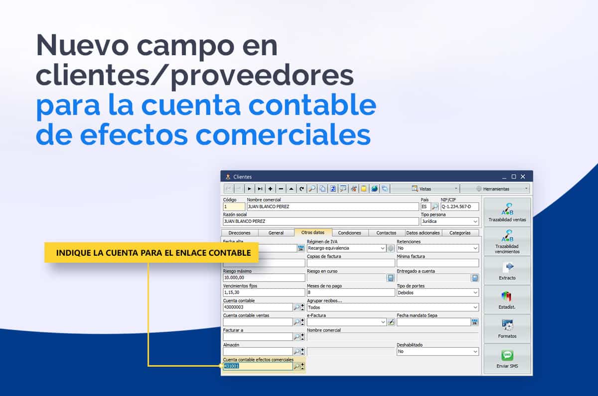 Otra de las mejoras añadidas a este proceso, es que a la hora de generar el efecto comercial de cliente o proveedor, si el enlace contable está configurado para que se realice a través de la fecha de emisión, el sistema filtrará los efectos por la fecha de emisión de los recibos, si no, lo realizará por fecha de factura, pudiendo elegir entre ambas posibilidades.