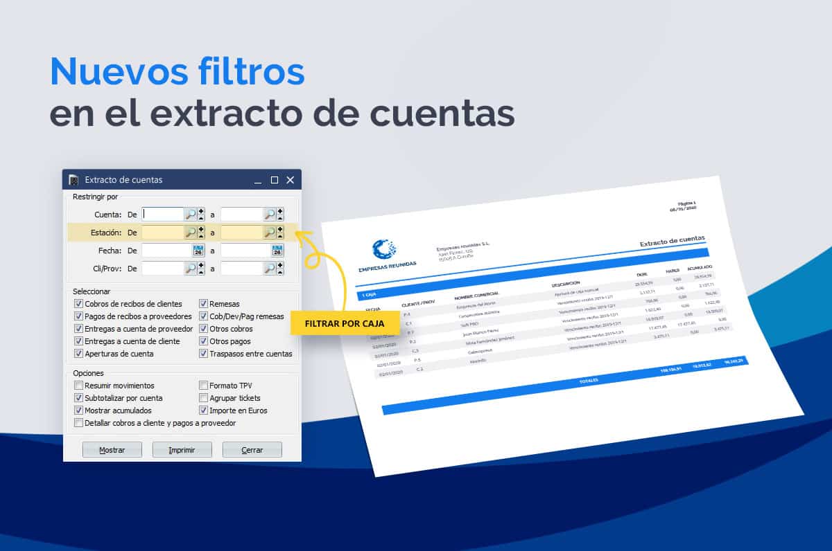 Cuando se trabaja con estaciones es muy útil ver el extracto de cuentas de cada una de ellas; por ello hemos añadido a nuestras soluciones la restricción por estación, además de las ya existentes de cuenta, fecha y cliente/proveedor.