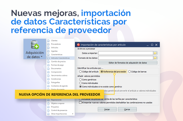 Lo único que necesitamos es que su proveedor le envíe un fichero en un Excel, Access, DB, DBF, CSV, TXT, entre otros y gracias a la adquisición de datos y la compatibilidad con formatos, podemos importar estos datos. Este servicio es una importante ventaja ya que podrá automatizar la importación de las tarifas de proveedor de forma sencilla y mecánica, evitando tener que dar de alta información de manera manual. Simplemente con que su proveedor le envíe las tarifas en los formatos descritos, la aplicación actualizará automáticamente toda la información relativa, como artículos, descripciones, precios, imágenes, etc. Además de todo esto, podrá exportar datos para realizar integraciones con otras aplicaciones o explotar la información desde otro sistema.