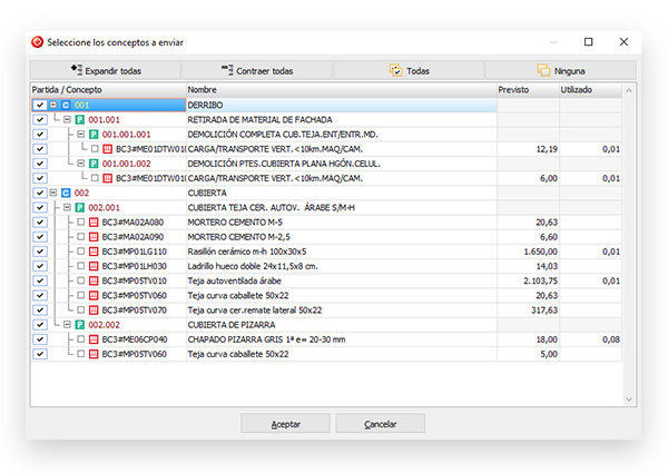 Los conceptos previstos son una utilidad de proyectos, que permite poder tener una previsión de aquellos materiales y recursos que prevemos que vamos a necesitar para la ejecución de una obra. También se tienen en cuenta, a la hora de dar de alta, artículos desglosados por capítulos y partidas.