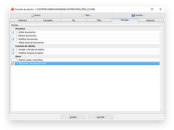 Además, hemos desarrollado un permiso en el formato de edición de previstos de proyectos para poder «seleccionar conceptos a pasar a utilizados», en caso de activar al pasar en un proyecto de previstos a utilizados saldrá una ventana con el árbol de capítulos y partidas y sus conceptos, en el que se podrá marcar cuáles se pasan, a nivel de capítulo, de partida y de concepto.