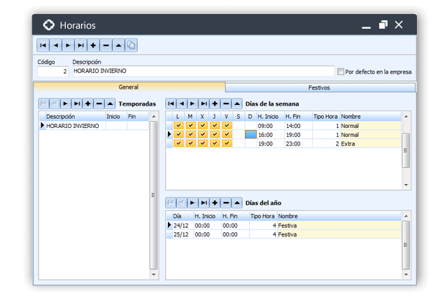 Defina los tipos de horarios que se manejan en su empresa definiendo horas de inicio y fin según tipo de jornada, días de la semana o festivo.