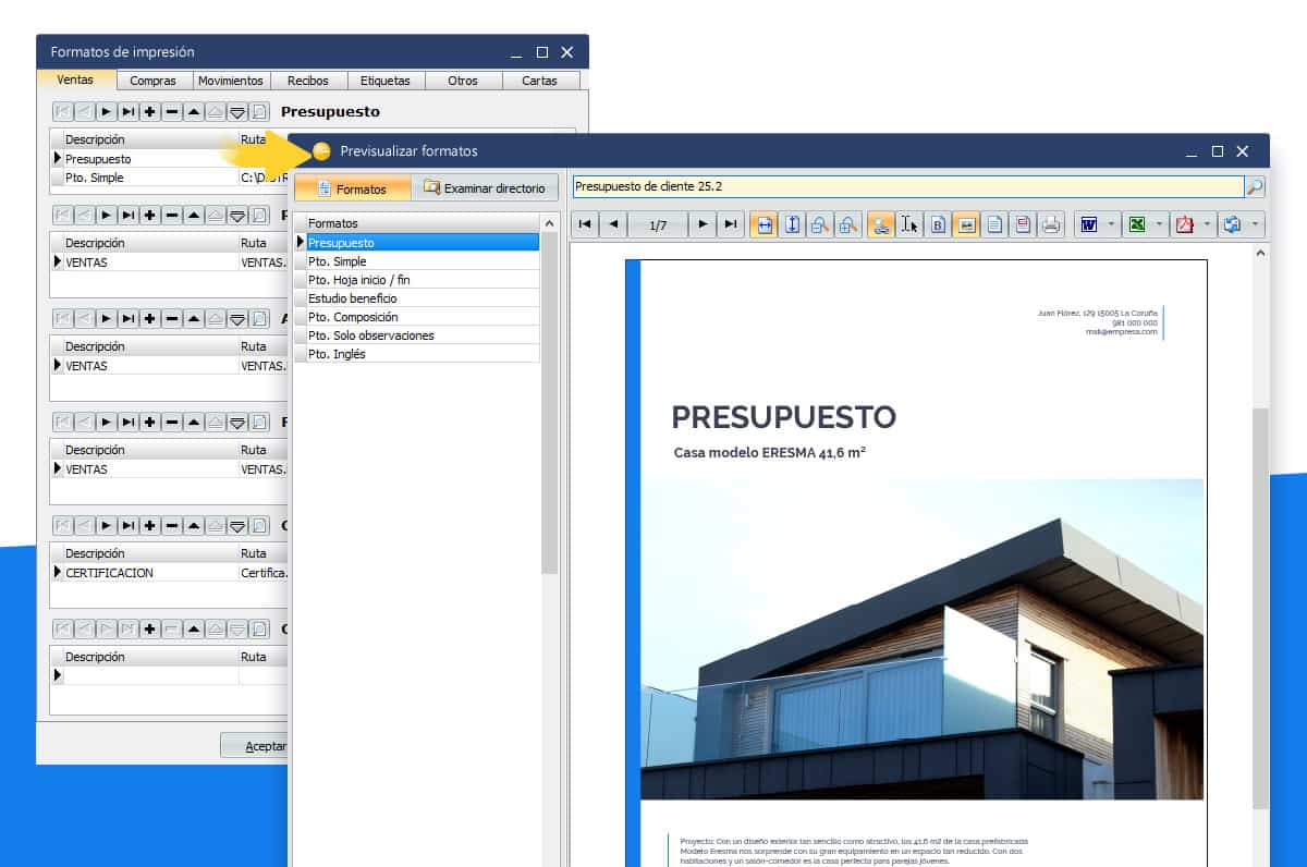 Esto a veces provoca en el usuario final de la aplicación dudas sobre cómo se verá cada formato con sus datos concretos; por ello hemos incorporado en nuestra última actualización un previsualizador de formatos de impresión directamente en la configuración de los mismos, pudiendo incluso escoger con qué documento exacto ya creado deseamos “ver cómo va a quedar”.