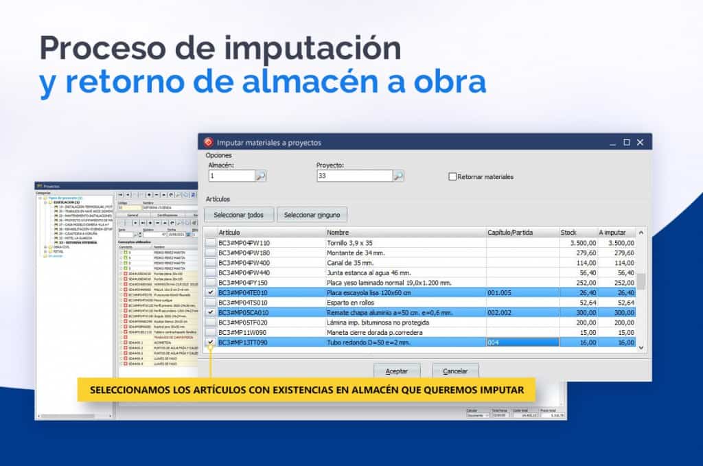 Mediante una checklist será posible seleccionar los artículos así como modificar la cantidad a mover. Pulsando el botón de imputar se imputarán los artículos seleccionados a un proyecto previamente seleccionado.