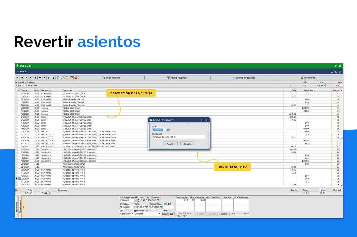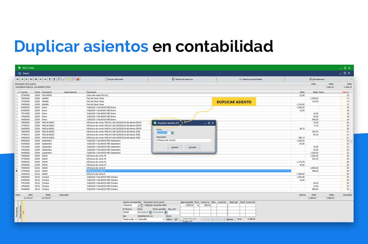 En la introducción de asientos de SQL Conta podemos añadir asientos de gestión como facturas de compra y venta, con sus correspondientes datos de IVA utilizándose a futuro para la emisión del libro de facturas emitidas y recibidas, así como asientos financieros como un préstamo, leasing, pago de interés y comisiones, siendo toda esta información el análisis de la situación financiera y patrimonial de nuestro negocio.