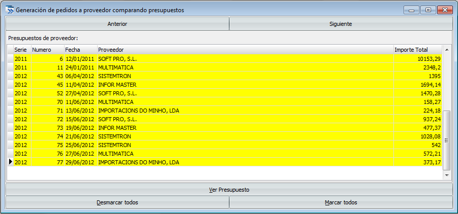 Obtenemos una lista de presupuestos de proveedor en base a nuestra búsqueda en el software ERP, con toda la información de cada uno de ellos.