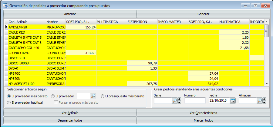 Una vez obtenida la comparativa y si estamos satisfechos con el resultado podrá generar automáticamente dichos pedidos, generando desde el software de gestión los documentos necesarios para enviar a sus proveedores.