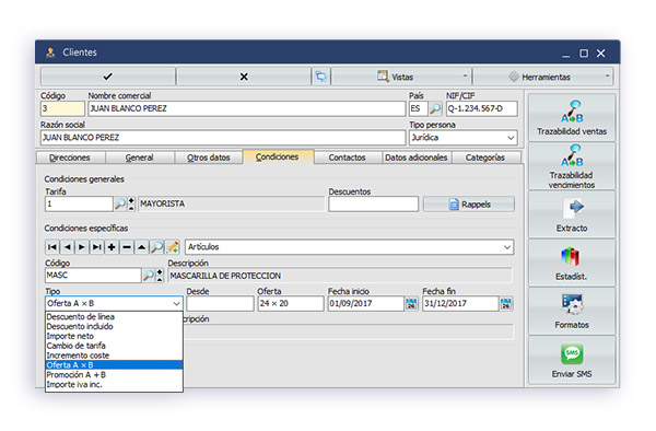 Dentro de nuestro ERP, en la solapa CONDICIONES, podrá determinar unas condiciones establecidas para los clientes o por los proveedores. Se podrá establecer una oferta de un % de descuento en línea, descuento incluido en el precio, un importe neto, un incremento porcentual sobre el coste o una oferta de A por B (2 por 1, 3 por 2…) para aquellos clientes que realicen una compra de N unidades de producto, y para un período de tiempo determinado. A través de intervalos de ofertas se pueden realizar distintos descuentos por volumen.
