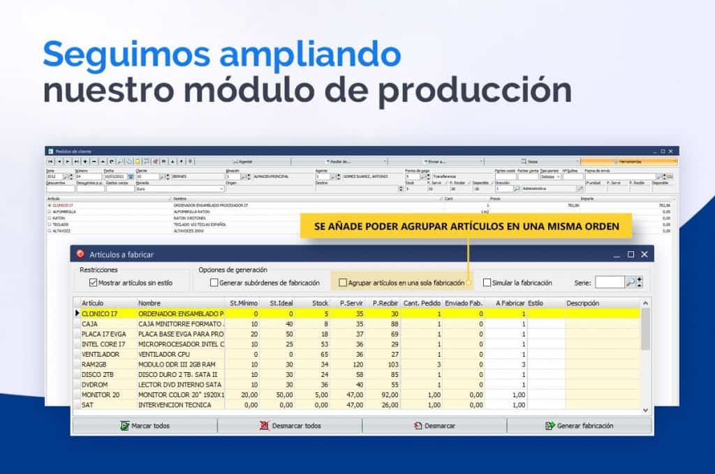 En nuestra constante por mejorar y añadir nuevos procesos al sistema, hemos añadido que al generar órdenes de fabricación desde un pedido de venta, se permita poder agrupar los artículos en una misma orden, tanto si tienen estilo como si tienen conceptos previstos.