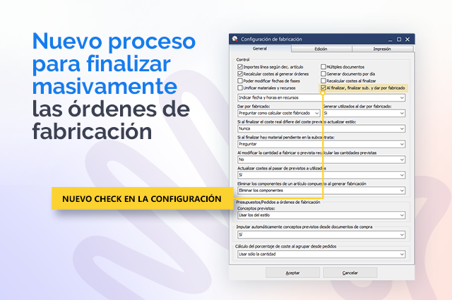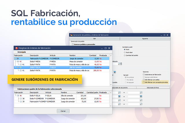 Nuestro ERP incluye la posibilidad de generar subórdenes de fabricación, desde Pedidos de cliente o Generación de pedidos y órdenes de fabricación.