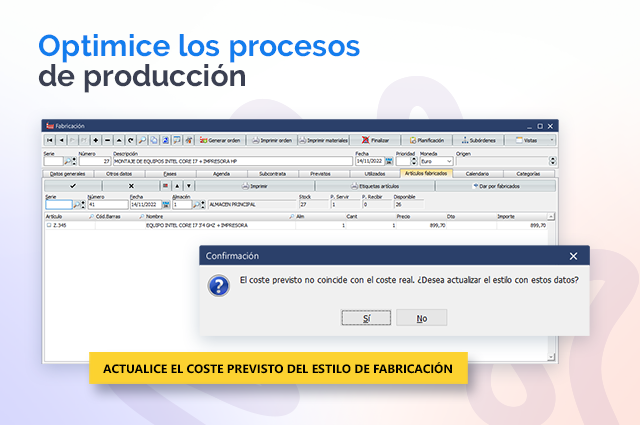 Nuestro módulo de fabricación, que se encuentra dentro de nuestro ERP, consigue dar solución a todas aquellas empresas con procesos de producción. Con él hemos conseguido solucionar la gestión de producción de cientos de empresas que necesitan controlar todo el proceso productivo, planificar fases de producción, imputación de consumos, desviaciones de costes, control de personal y material, gestión documental, doble unidad de medida, entre otras muchas posibilidades, ayudándoles a lograr una fuerte ventaja competitiva y un conocimiento total de sus manufacturas.