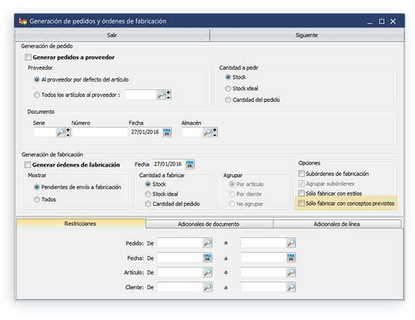 Se ha añadido a la pantalla de Generación de pedidos y órdenes de fabricación el soporte a los conceptos previstos existentes en los Pedidos de cliente que no se había añadido cuando se implementó esta funcionalidad.