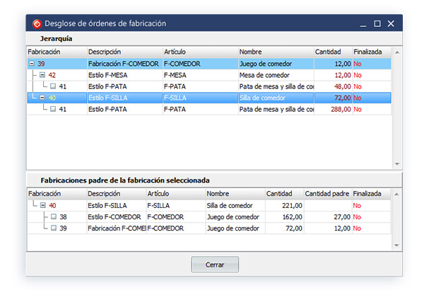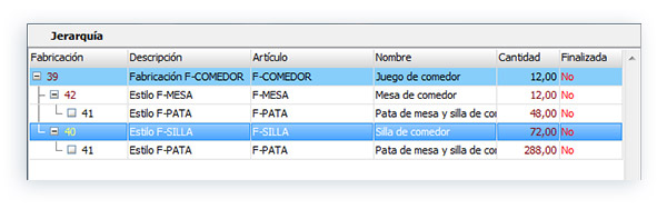La rejilla de Jerarquía nos muestra la jerarquía de fabricación asociada la orden de fabricación mostrada en la primera fila y marcada con un azul claro.