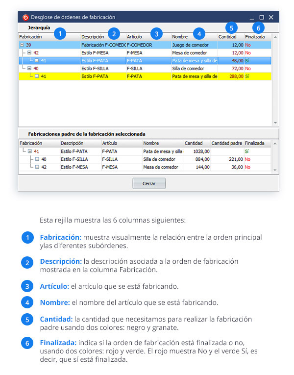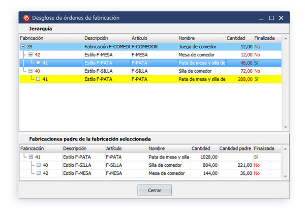Como podemos ver en la imagen la última fila de la rejilla está resaltada en amarillo. Este resaltado nos sirve para localizar fácilmente las subórdenes que aparecen más de una vez en la jerarquía. En la misma imagen vemos que está seleccionada la primera orden de fabricación que tiene código 41 y que, al mismo tiempo, esta resaltada en amarillo la última fila que tiene el mismo número de orden de fabricación. Si en el ejemplo que estamos utilizando, la fila seleccionada fuera la última, la fila que aparecería resaltada en amarillo sería la primera.