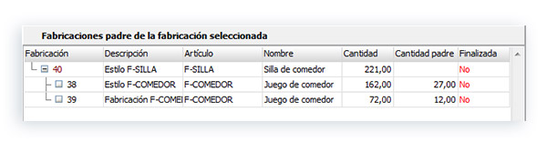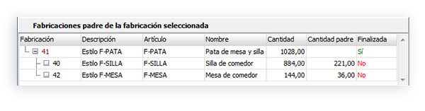Rejillas de fabricaciones padre de la fabricación seleccionada