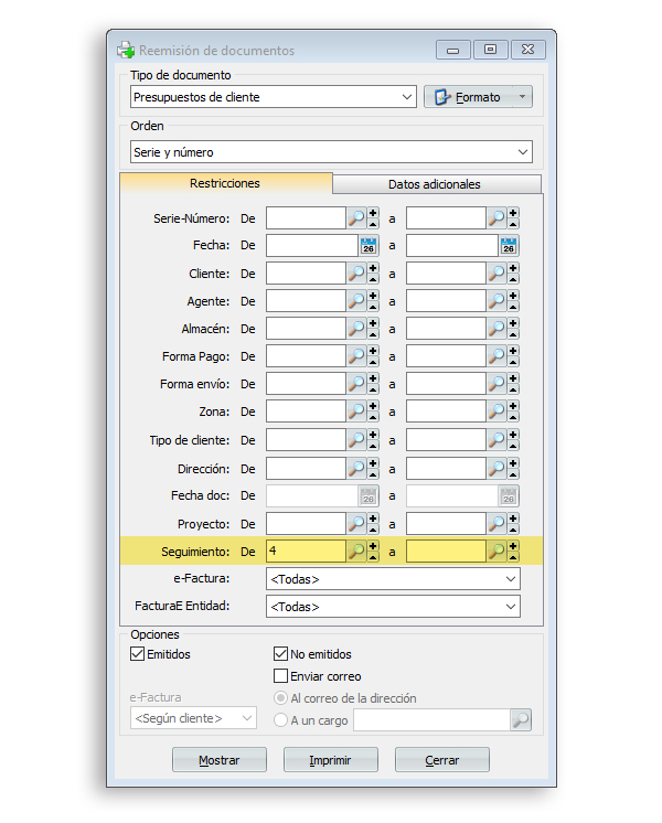 Es importante añadir que la reemisión de documentos facilita notablemente el trabajo en nuestras soluciones, ya que existe tanto en compras como en ventas. Gracias a esta función, podemos emitir o reemitir, todos los documentos necesarios con una serie de restricciones, como tipo de documento, fecha, cliente, agente, almacén, etcétera. Esto, por ejemplo, nos permite enviar de una vez toda la facturación del mes, tanto de manera impresa en papel, como por correo electrónico.