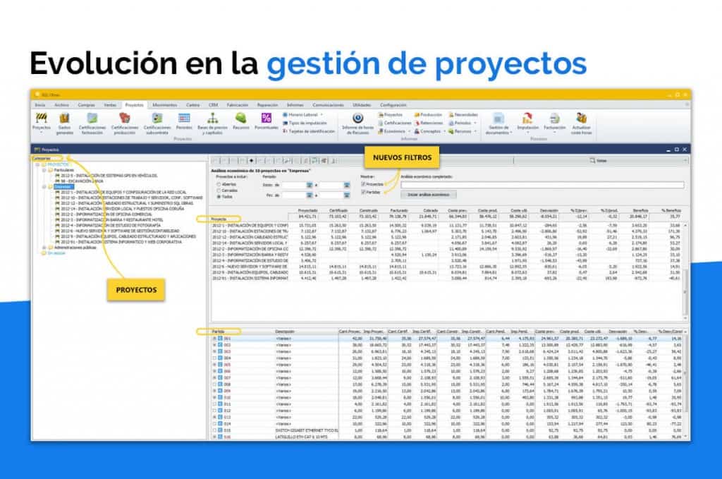 El módulo de proyectos nos permite administrar el ciclo de vida de sus obras e instalaciones, generando presupuestos, capítulos y partidas, vistas en modo árbol, mediciones, cambios de precios, costes indirectos, importación y exportación en BC3, bases de precios, planificación, imputación de costes, certificaciones, facturación, mano de obra, subcontratas, utillajes, EPIs, equilibrando las cargas de …