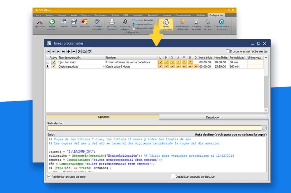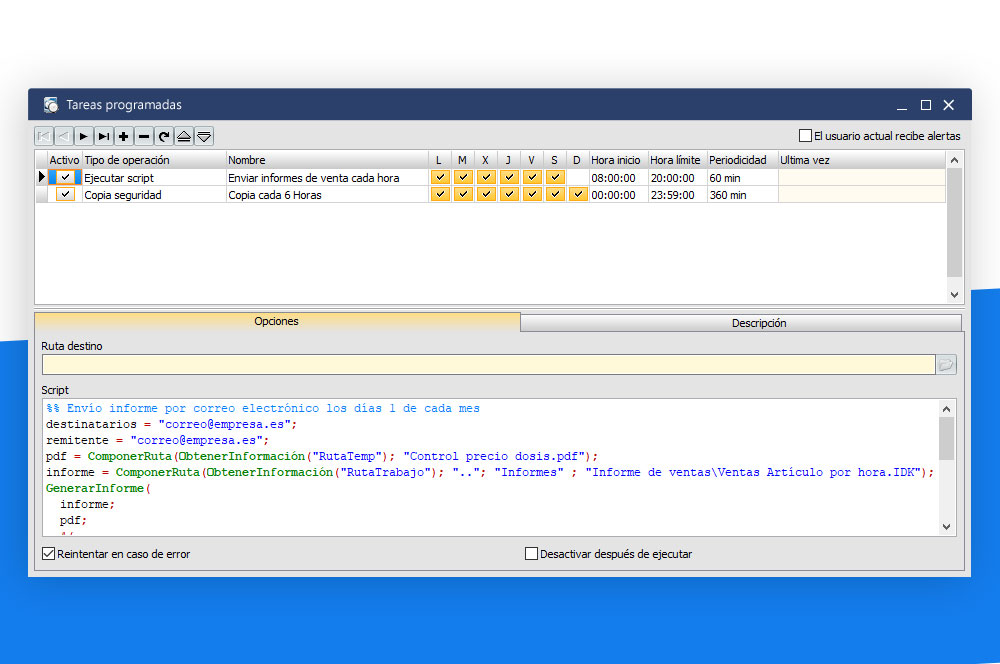 Podemos definir qué días se realiza cada tarea, podemos definir las horas a las que se debe realizar (para minimizar el impacto en la productividad lanzarlas fuera de horario laboral) pero en nuestra última actualización ahora también permitimos definir tareas repetitivas. Imagínese que su programa le envía cada hora un informe con las ventas registradas en el sistema; con las aplicaciones de gestión empresarial de Distrito K es posible.