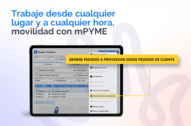 Ahora hemos añadido una nueva mejora a mPYME Documentos, consiste en la misma función explicada anteriormente, es decir, que desde pedidos de cliente podamos generar pedidos a proveedor, dotando a esta solución de movilidad de cada vez más opciones de aplicación de escritorio.