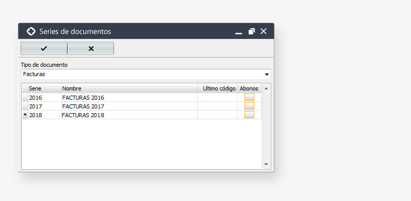 De esta manera, cuando llegue el nuevo año no tendremos que abrir ningún ejercicio y continuaremos en el mismo, tan sólo será necesario si se requiere, realizar 2 cambios: Si usted usa series de documentos, deberá crear nuevas series en los documentos para que los contadores de facturas, albaranes, pedidos… empiecen otra vez en 0. Para ello nos iremos a Archivo – Series de documentos y crearemos una nueva serie para cada tipo de documento que queramos inicializar los contadores. La imagen muestra que para el ejercicio 2018, el contador de las facturas comenzará en 0 y esto mismo podemos realizarlo para el resto de documentos.