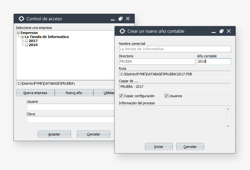 La 2ª opción que tenemos es la de abrir un nuevo año mediante una base de datos nueva e independiente de la que estamos. Para ello nos iremos a Configuración – Cambiar de usuario o empresa y ahí podremos crear un nuevo año. Una vez indicado un nuevo año, nos generará una nueva base de datos con el nuevo ejercicio y podremos indicar si queremos copiar los usuarios y la configuración de la empresa. De esta forma, nos creará un nuevo año con los usuarios y los formatos del ejercicio anterior pero de momento vacía en cuanto a datos.