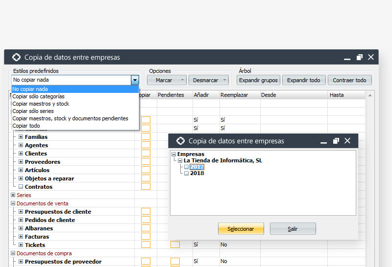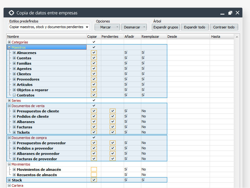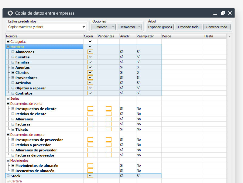 En la siguiente ventana nos aparecerán todas las opciones que podremos copiar del ejercicio anterior. Así iremos marcando todos los datos que nos interesan copiar al ejercicio actual, pasando sobre todo los maestros de un ejercicio a otro. En esta ventana podremos marcar cada una de las opciones o desmarcarlas, expandir todos los grupos para ver todas las subopciones de cada proceso así como poder filtrar el desde hasta de los datos que queramos copiar. Para facilitar el proceso de copia de datos se han establecido una serie de estilos predefinidos con las opciones más comunes de copia de datos. Los estilos que podremos escoger serán: -Copiar sólo categorías -Copiar maestros y stock -Copiar sólo series -Copiar maestros, stocks y documentos pendientes -Copiar todo.