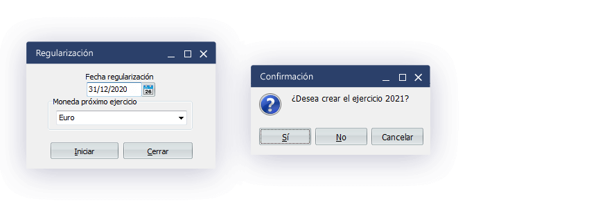 En caso de que no hubiéramos creado todavía el nuevo ejercicio y realizamos la regularización en el ejercicio actual desde Procesos – Cierre año – Regularización nos preguntará también si queremos crear el nuevo ejercicio. Si le damos que sí nos creará el nuevo ejercicio copiando el plan contable igual que si le damos a nuevo año como en los pasos anteriores. Si realizamos el cierre también nos creará el asiento nº 1 de Apertura pasando todos los saldos de las cuentas.