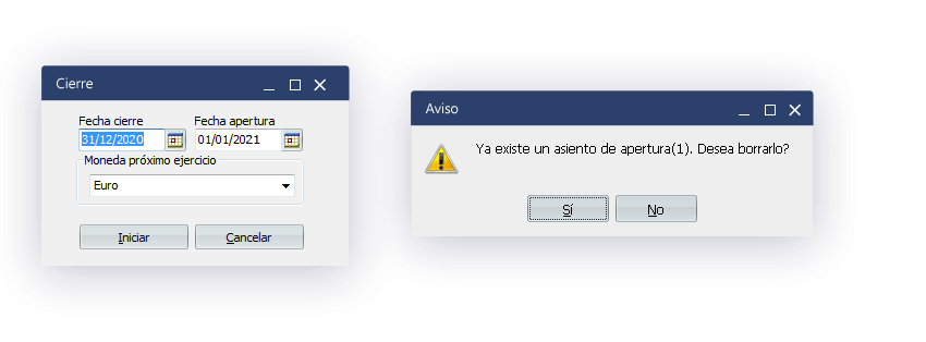 Estos cierres los podremos realizar tantas veces como queramos pudiendo eliminar el cierre en el 2020 para seguir trabajando e introduciendo nuevos asientos (si vamos al diario y nos situamos sobre el asiento de cierre y le damos a eliminar borrará el cierre y también podríamos eliminar la regularización), y dejar el asiento de apertura en el 2021 hasta la siguiente vez que volvamos a realizar el cierre donde nos preguntará si queremos eliminar el asiento de apertura y donde le indicaremos que SÍ para que actualice los saldos del asiento de apertura con el nuevo cierre.