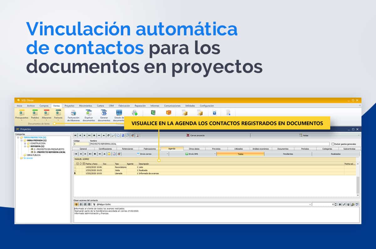 Hemos añadido una nueva funcionalidad a la agenda para mejorar el seguimiento de los proyectos. A partir de ahora, cuando en un documento registremos un contacto, este se vinculará de manera automática con el proyecto asociado. De esta manera, podremos tener una visión global de todos los contactos, desde la agenda del proyecto, lo que nos ayudará en el seguimiento y conocimiento de todos los movimientos registrados.