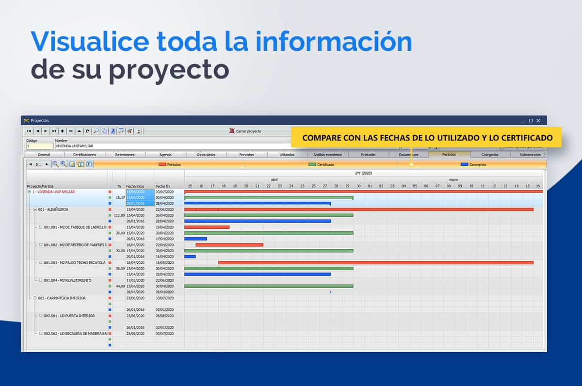 En el módulo de proyectos, tenemos la opción de periodos o diagrama de Gantt, ahora hemos añadido la opción de además de la gráfica de previstos, el poder compararlo con las fechas de lo utilizado y con lo certificado para poder ver posibles desviaciones.