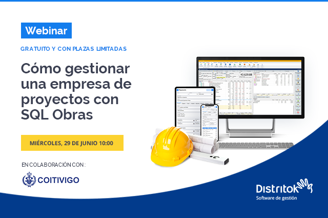 Gracias a esta experiencia y en colaboración con COITIVIGO tenemos el gusto de presentarles un nuevo webinar que se celebrará el 29 de junio de 10:00 a 11:00 de la mañana, y que hemos titulado: Cómo gestionar una empresa de proyectos con SQL Obras.