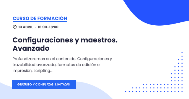 Hoy queremos dar un paso más allá y presentar un nuevo webinar que se celebrará el jueves 13/04/2023 de 16:00 a 18:00 y que tiene como objetivo la especialización en las funcionalidades de nuestro ERP en configuraciones y maestros avanzado, que será la secuela del primer webinar en donde nos hemos adentrado en las opciones de configuración de estas opciones.
