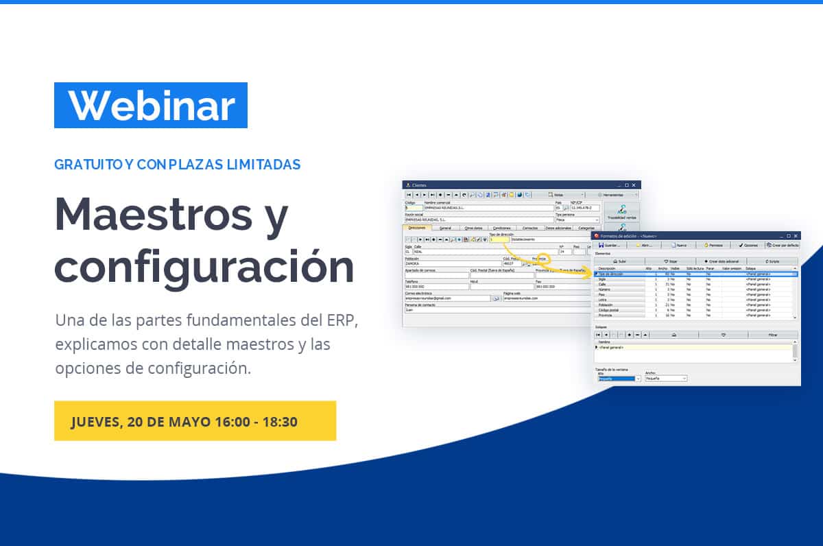 Dada la gran acogida de los webinar ya realizados, queremos presentarle el nuevo curso que se realizará el jueves día 20 de mayo en horario de 16:00 a 18:30, orientado a todo tipo de empresas y basado en las funcionalidades de nuestro sistema sobre maestros y configuración.